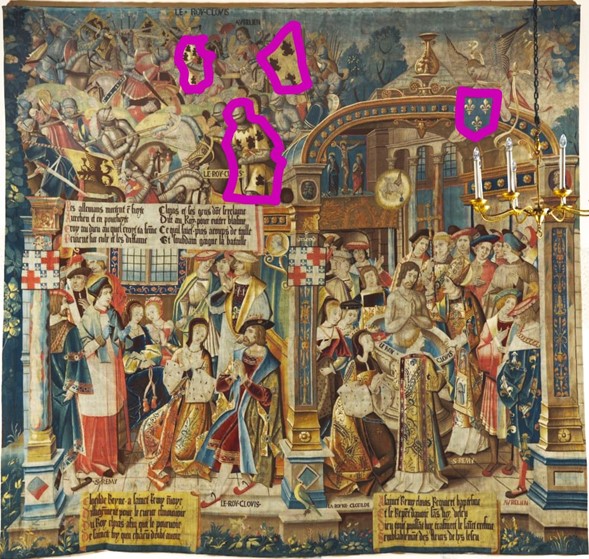 The significance of the two arms, and the transition between them, centres on Clovis. His reign was a key moment in French history because he was the first Christian king of the Franks. The tapestries and arms all reference a collection of medieval legends regarding the conversion of Clovis to Christianity.