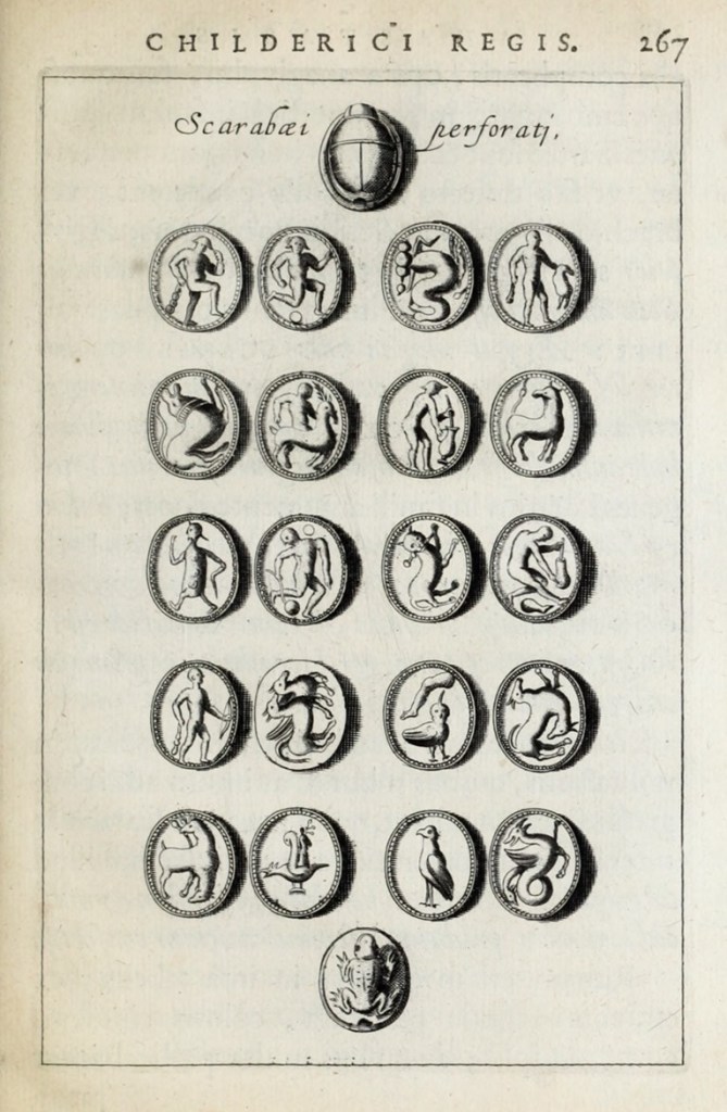 “…instead of going back to the actual treasure, which had been in the royal library in Paris since 1665, [Montfaucon] simply reproduced Chifflet’s plates. Along with the medals and coins found in the tomb, he included Egyptian scarabs which his predecessor had introduced for purposes of comparison. Montfaucon thought that these, too, were Merovingian. Far from suspecting his mistake, he felt that some great mystery underlay the presence of these objects. He was always on the look-out for traces of antiquity; so he wrote: “I am surprised to find a stag-beetle here–an object of Egyptian superstition . . . could these beetles have reached France from Egypt at this early period? In another oval there is a frog, which is also to be found fairly frequently on Egyptian monuments.””[34]