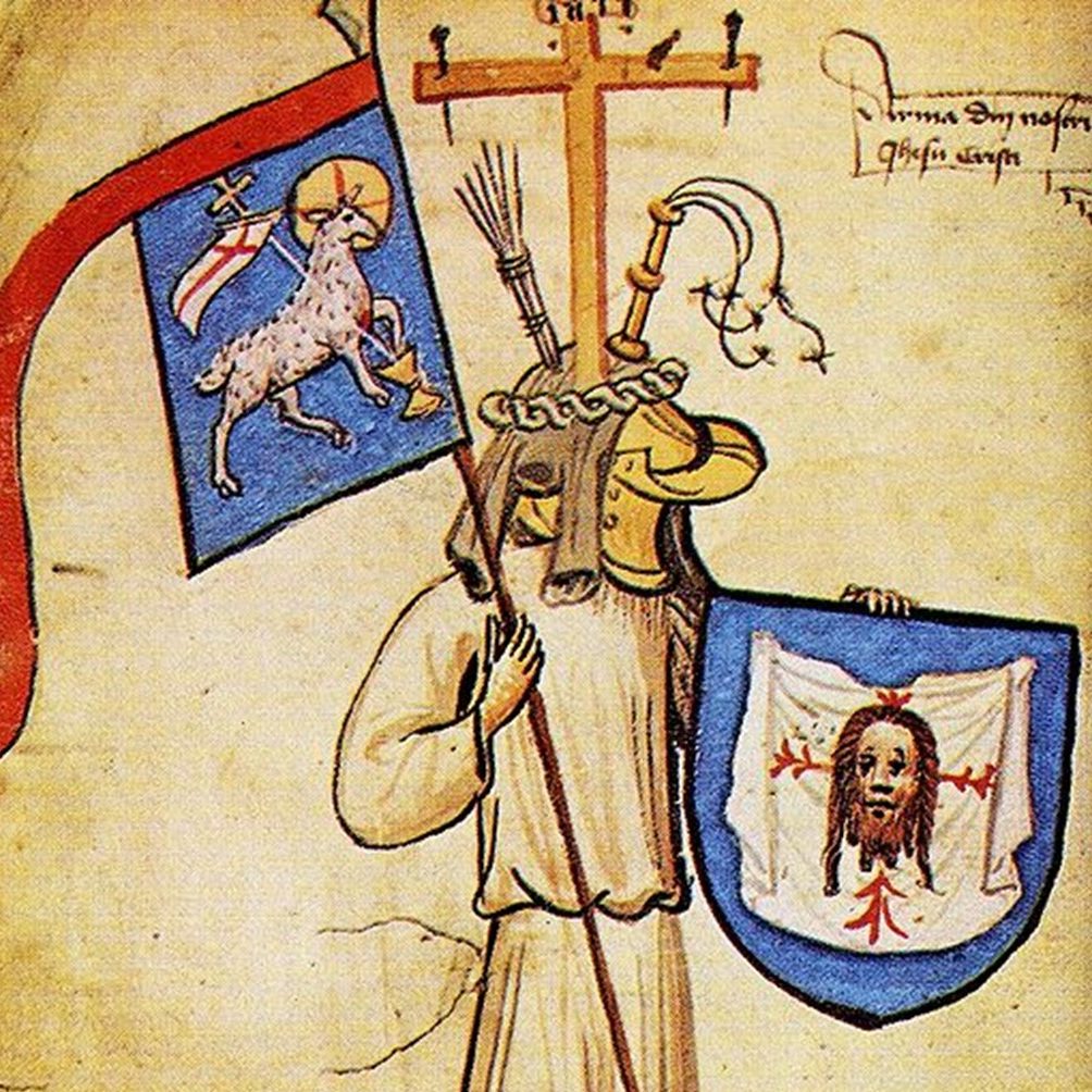 On the Hyghalmen Roll,[13] a 15th century roll of arms from Cologne, Germany, Jesus himself is shown wearing plate armour and carrying a shield with the head of Judas, alongside various other items related to his ministry. Produced a century before the tapestries of Clovis,[14] it is not intended to be historically accurate but show emblems of his victory and status.